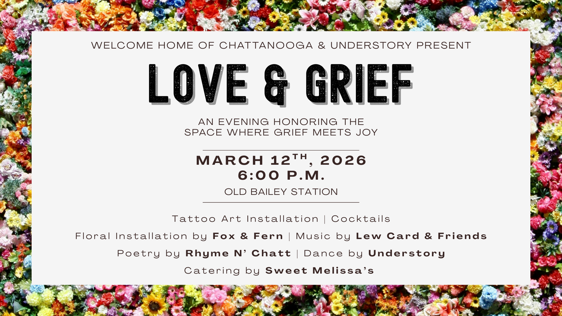 A participatory floral art installation by Fox & Fern beckons you to allow your heartache and happiness to co-exist. Poetry by Rhyme N’ Chatt speaks to the heart’s capacity for both sorrow and serenity. Love & Grief offers a safe space to find comfort and celebration amongst friends both old and new.